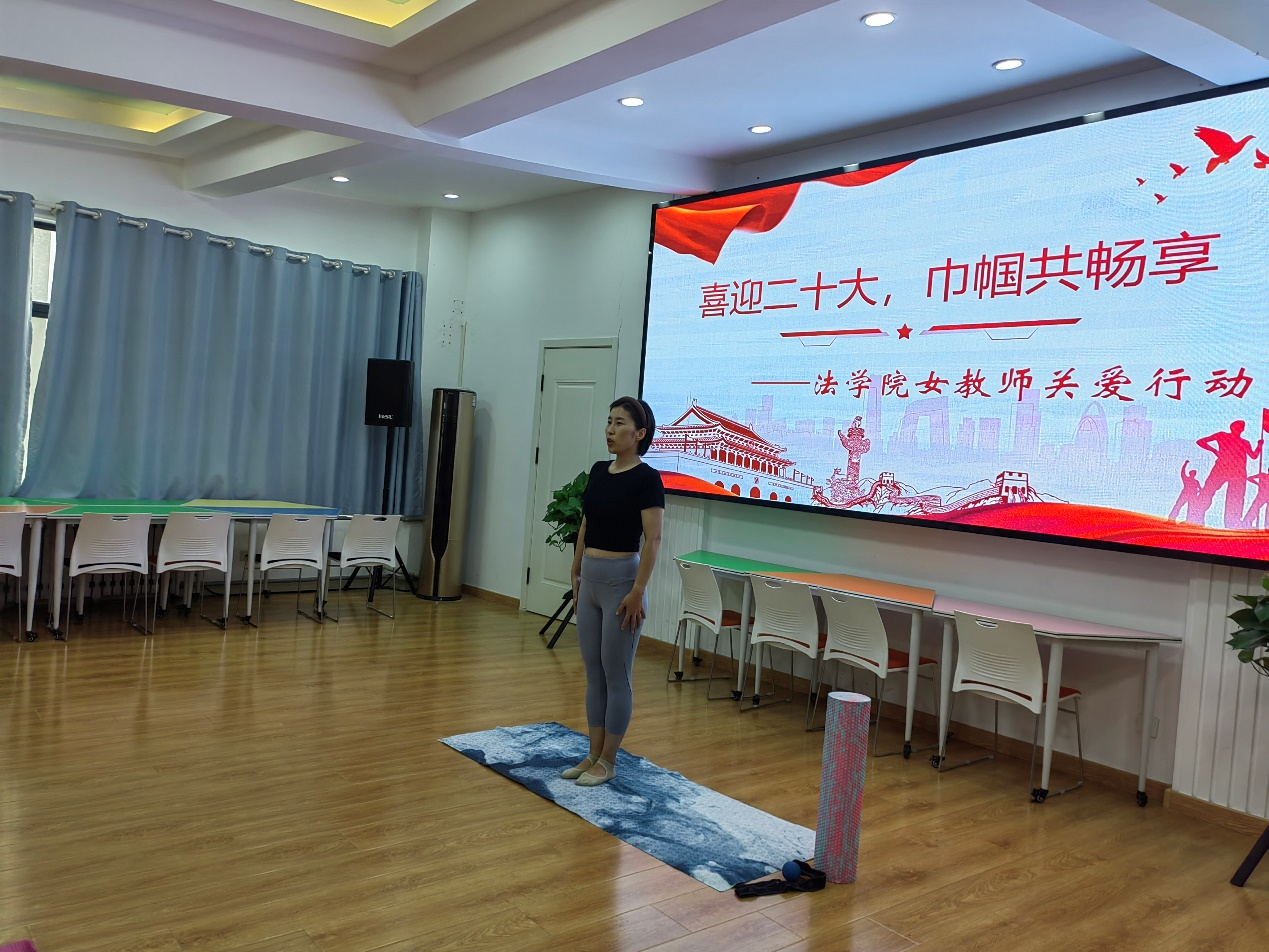 行动之二:女教职工们在法律系田源老师的带领下进行瑜伽体验。通过四十分钟的舒缓活动,缓解了一天的疲惫,大家一起享受放松、舒适的身心状态。