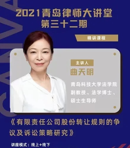 近日,由青岛律师学院主办、市律协公司专业委员会承办的第三十二期青岛律师大讲堂在诺德广场市律协会议室举行。本期大讲堂公司专委会邀请到青岛科技大学法学院巾帼普法宣讲团负责人曲天明老师主讲。