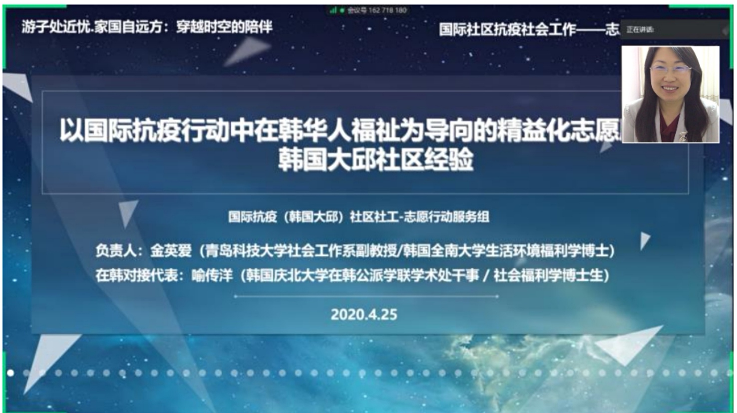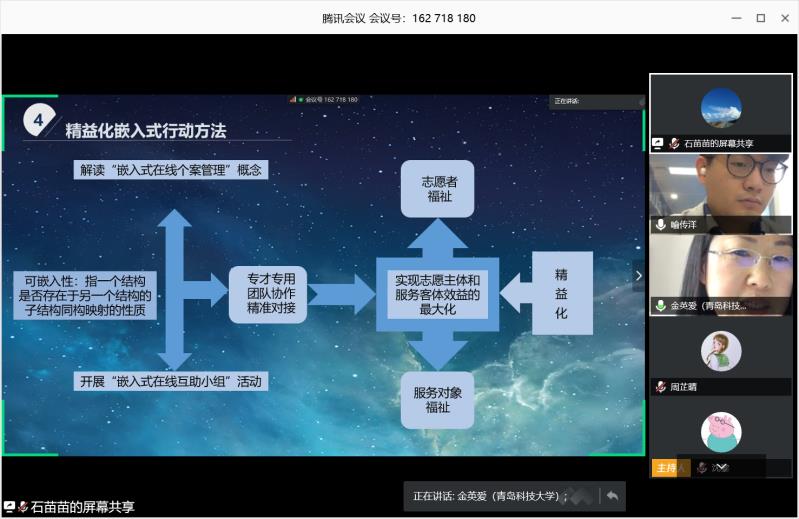 中韩国际社区抗疫行动负责人、青岛科技大学社会工作系金英爱副教授,与在韩对接人代表、韩国庆北大学在韩公派学联学术处干事喻传洋博士生,以《以国际抗疫行动中在韩华人福祉为导向的精益化志愿服务:韩国大邱社区经验》为主题,进行了一场“隔空对接式”联合发言。两位代表的发言以时间为线索,以数据为证据,详细描述了自今年2月底以来,行动组秉承“奉献、友爱、互助、进步“的志愿精神,通过精益化嵌入式的社会工作专业方法,为韩国疫情最严重的大邱广域市中国留学生和多文化家庭等2300多名华人群体提供在线公益服务的实务经验和研究成果。