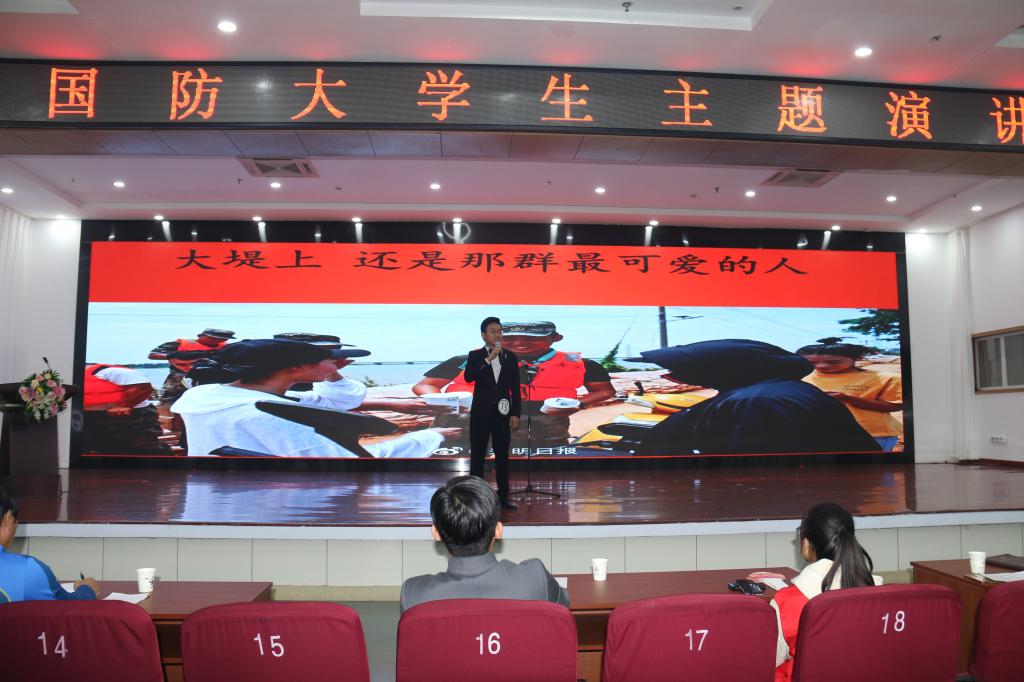 高梓彬演讲的题目是《大堤上,还是那群最可爱的人》,以人民子弟兵们防洪抗涝斗争为主线,叙述自今年6月以来,我国进入汛期后,出现的严重汛情,并且讲述了一个个人民子弟兵抗洪防涝的感人故事,正是这样一种人民子弟兵们所体现出的“我将无我,不负人民”的家国之情,一次次地打动了在座的每一个人。高梓彬同学用朴实而富有激情的演讲讴歌了党领导下的人民军队的责任意识,赞颂了人民子弟兵们的使命与担当,抒发了新时代青年人对人民军队的爱戴与崇敬之情。
