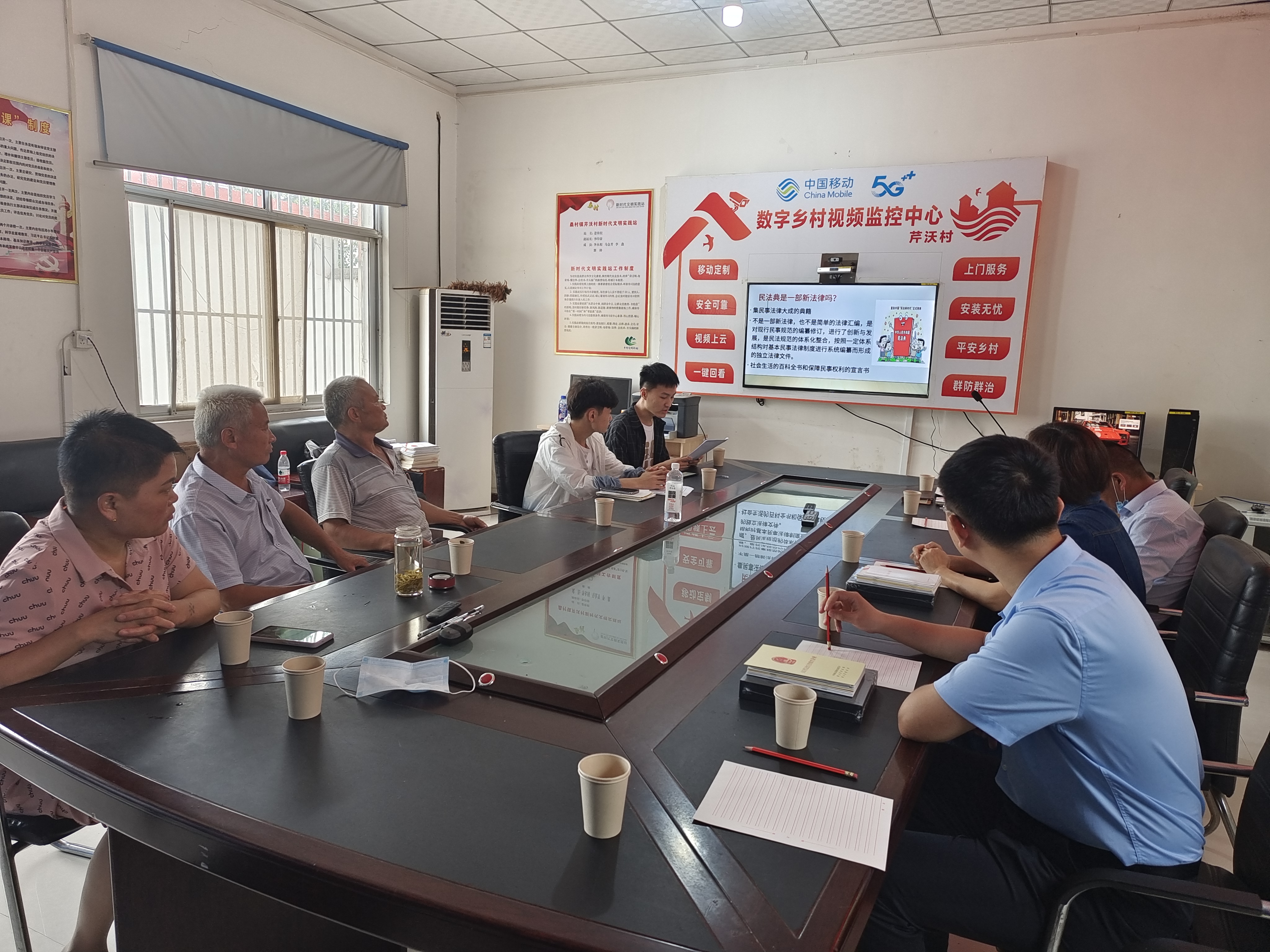 7月12日,芹沃村村委会召开村委会,山亭区委副书记、桑村镇第一书记、芹沃村书记、芹沃村妇女主任等参加座谈会,就芹沃村现有的法律问题和芹沃村法律宣传工作的开展以及法治政府的建设和支教团展开交流。随后,支教团和山亭区委副书记一起为芹沃村三个自然村发放了包括社会保障法、保险法、妇女权益保障法等多部法律在内的法条。当日下午,支教团结合当地实际情况和当地派出所联合举办了警民恳谈会,进行了防诈骗相关的法律知识普及。