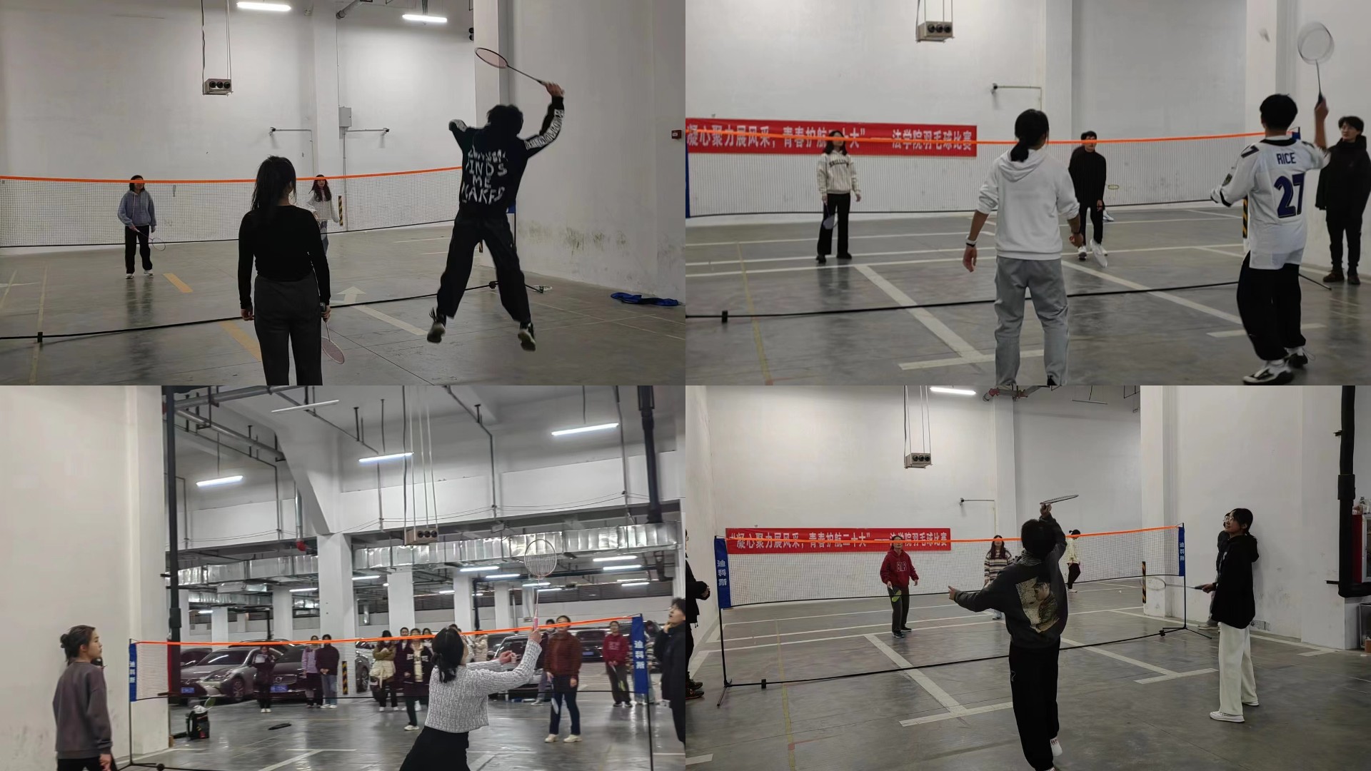 比赛过程中,同学们紧握球拍,凌空飞跃,转腰,用力,挥拍一击,在半空中形成一条条完美的弧线。同组的同学相互配合,灵活走位,每一次精彩的挥拍都引起了场下观众的欢呼呐喊,激励球员的同时也活跃了赛场氛围。