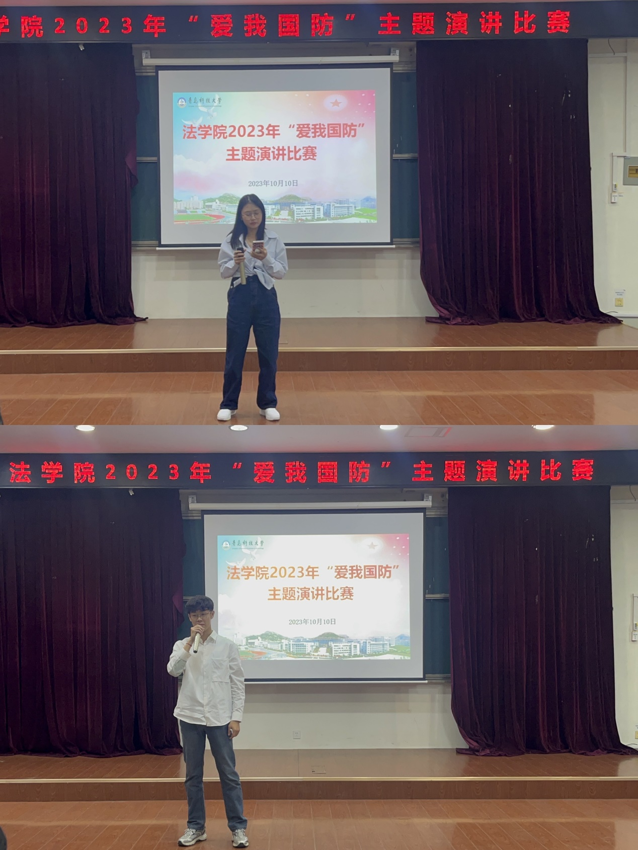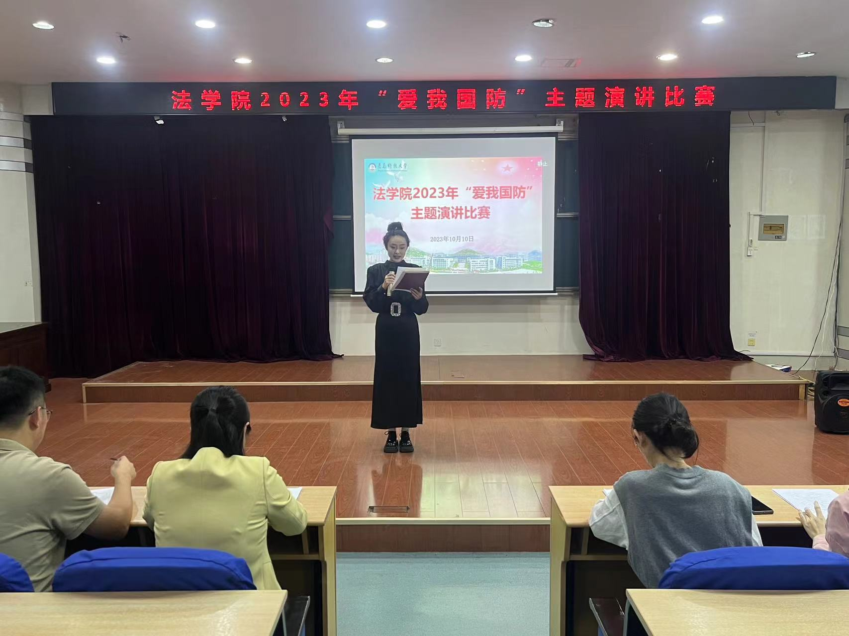 为助力在校大学生了解国防知识,掌握国防技能,激发大学生关心国防、热爱国防、建设国防、保卫国防的政治热情和行动自觉。10月10日下午,法学院于弘毅楼A201举办“踔厉奋发强国防,勇毅前行向复兴”爱我国防主题演讲比赛。法学院党总支副书记兼副院长王祥梅、学工办主任兼团委书记付继航、辅导员王梦珂和2022年校“爱我国防”演讲比赛一等奖获得者满恒宇担任评委,学院2023级新生百余人参加了活动。