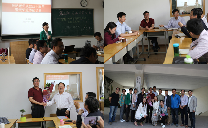 5月17日下午,法学院在3012室举行了杨喆老师从教40年暨光荣退休座谈会,以感谢杨喆老师多年来对学院教育事业和学科发展做出的贡献。法学院党总支书记兼院长张鸣、副院长王金堂和部分师生代表参加了座谈会。座谈会由学院工会主席宋敏主持。