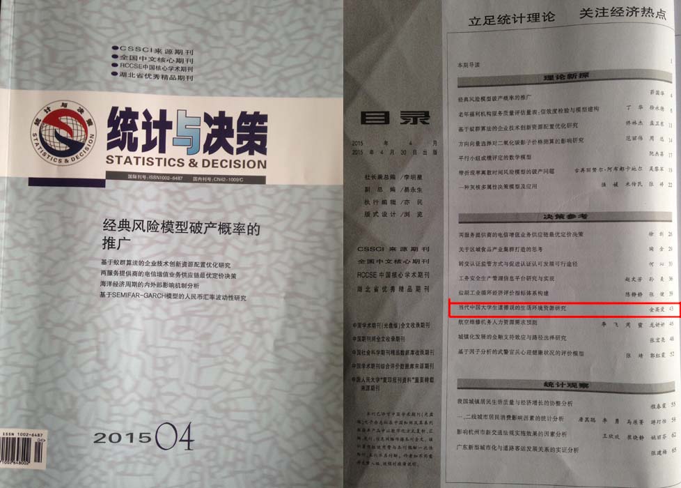 近日,我院社工系金英爱老师在《统计与决策》2015年第4期发表论文《当代中国大学生道德观的生活环境资源研究》,该论文为青岛科技大学2014年度教学研究与改革立项重点项目(01051101)“高等学校分层动态式德育体系构建研究”的阶段性成果。