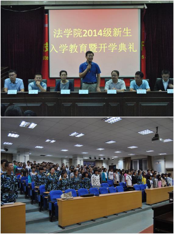 9月16日晚,法学院2014级新生入学教育大会在模拟法庭举行。法学院党总支书记兼院长张鸣、副院长王金堂、分团委全体老师、部分教师代表和2014级新生共同参加了大会。