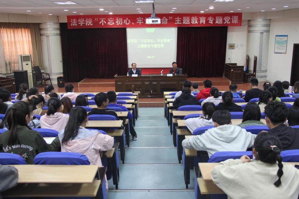 10月15日下午,法学院在模拟法庭举行“不忘初心、牢记使命”主题教育专题党课,邀请我校马克思主义学院原院长杜裕禄、法学院院长王金堂分别为学院师生讲党课。法学院全体师生党员、入党积极分子和部分入党申请人参加了党课学习。