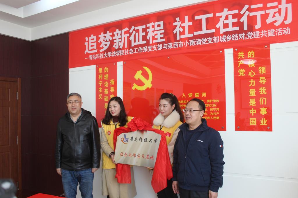 3月23日,在第13个国际社工宣传周到来之际,青岛科技大学法学院与莱西市小雨滴社会工作服务中心共同举办了共建社会工作实习基地签约揭牌仪式。法学院院长王金堂,院长助理陈为智,社会工作系主任王卫国,社会工作系教师李亚妮,莱西市政协副主席吕英志,莱西市河头店镇党委书记崔旭升,莱西市民政局副局长王朋亮,河头店镇人大副主席王彦波,莱西市小雨滴社会工作服务中心负责人董金辉出席了本次签约仪式并共同为实习基地揭牌。签约仪式由河头店镇党委副书记张鑫主持。