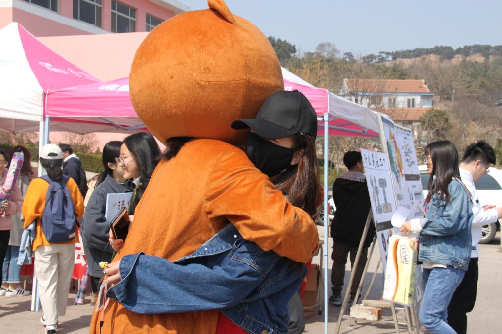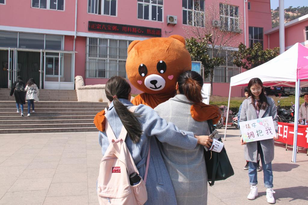 在“抱抱熊”活动中,身着玩偶熊服装的同学敞开怀抱,接纳他人,在春日里给陌生人一个拥抱,让这个春天更加温暖和谐,通过拥抱打破人与人之间的距离,将社工专业中的为他人服务的利他主义表现了出来。
