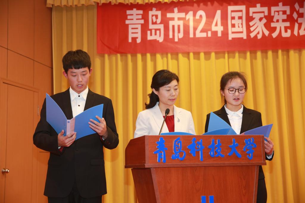 青岛市“普法讲师团”讲师、青岛科技大学法学院副教授宋敏与法学院学生代表一同诵读了宪法部分内容。