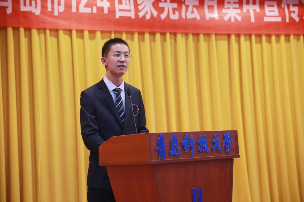 第三届全国学生“学宪法、讲宪法”活动全国总决赛三等奖获得者、青岛科技大学法学院法学161班田野同学宣读了《12.4国家宪法日倡议书》,号召青年学子自觉把重任扛在肩上,从自己做起、从点滴做起,使宪法成为我们每个人的坚定信仰,使尊法学法守法用法成为我们每个人的行为习惯,为实现伟大的法治中国梦贡献自己的智慧和力量!