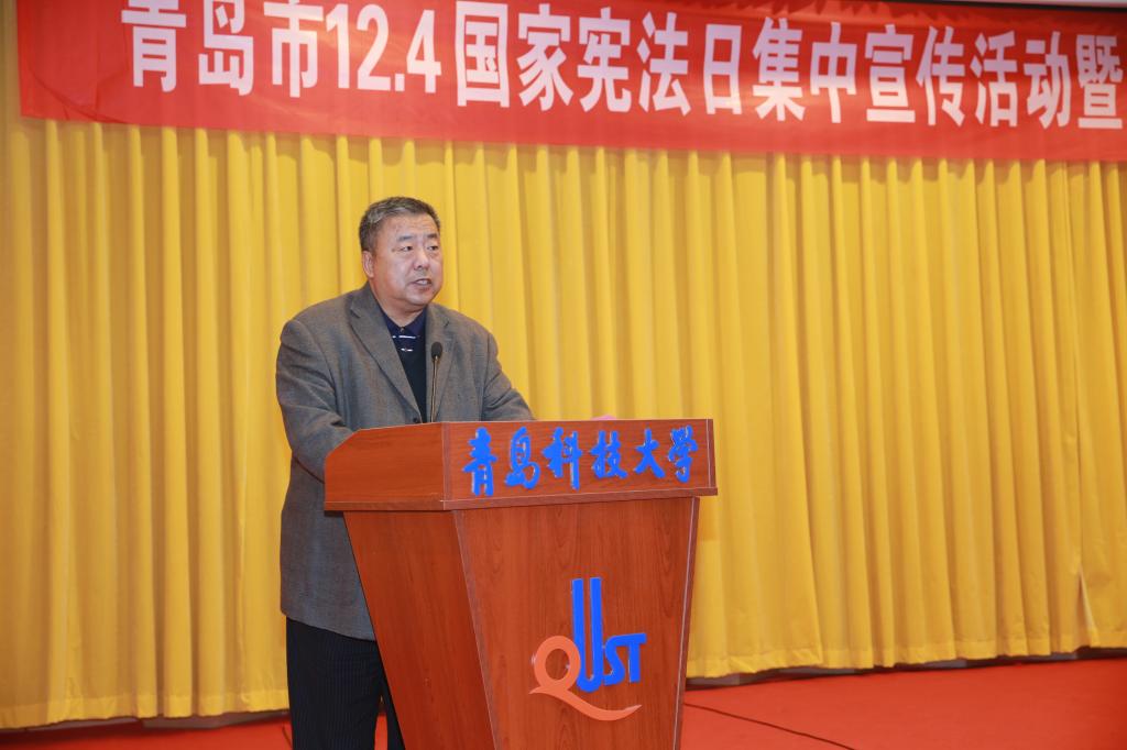 校党委副书记张元利致辞。他表示,青岛科技大学历来高度重视法律教育宣传工作,学校法学及社会工作学科完善,法律教育和宣传平台完善; 青岛市12.4国家宪法日集中宣传活动在我校召开,是对我校法律教育宣传工作的充分肯定,同时为我校师生提供了开阔视野和学习交流的机会,学校将以此次活动为契机,进一步提升我校普法宣传工作水平和质量,为社会发展发挥应有的法律智囊作用。