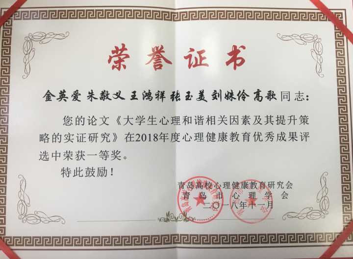 我院社会工作系的金英爱老师的论文《大学生心理和谐相关因素及其提升策略的实证研究》获评2018年度心理健康教育研究优秀成果(论文教材类)一等奖。