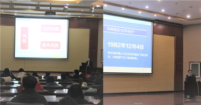 5日下午,法学院联合校工会在崂山校区第一报告厅举办“工会普法大讲堂”活动,邀请教职工法律咨询服务中心的于冠魁老师和卢海波老师为全校师生作普法讲座。两位老师分别围绕宪法日的由来、宪法与公民的关系、日常生活中的法律风险提示与防范、房屋买卖合同风险防范等方面为到场师生进行了讲解。