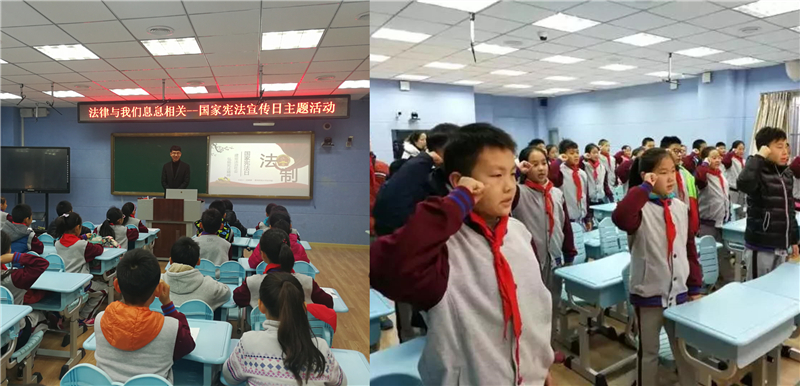 法学院的普法志愿者还走进了青岛福林小学的课堂,用宪法动画片等活泼生动的形式引导同学们积极思考,从宪法的重要地位、宪法日的起源、现行宪法典的内容等方面,为同学们带来了一节生动的宪法教育课。课后,志愿者带着同学们进行了拥护宪法精神宣誓。
