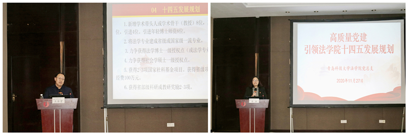 11月28日晚,全体教职工在教育基地开展了“以高质量党建引领法学院十四五发展规划”的研讨会。会上,院长王金堂从十三五规划完成情况、经验和问题、下一聘期目标、十四五规划目标四个方面详细讲解并部署了学院教学、科研、学科和社会服务方面的规划和目标。党总支书记李卉鼓励全体教职工尤其是党员教师充分发挥先锋模范作用,敢于担当作为,积极带头认领学院下一聘期目标任务,激发了参会教师的热情和斗志。