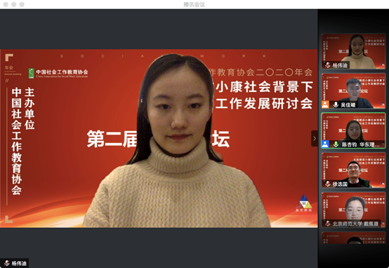 2020年12月28日,由中国社会工作教育协会主办、华东理工大学承办的“中国社会工作教育协会2020年年会第二届研究生论坛”,通过线上会议的形式隆重召开。中国社会工作教育协会副会长向德平教授、华东理工大学社会与公共管理学院徐选国副教授、集美大学法学院副院长姚进钟副教授、甘肃政法大学公共管理学院副院长任文启教授等专家学者出席论坛。