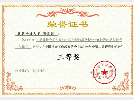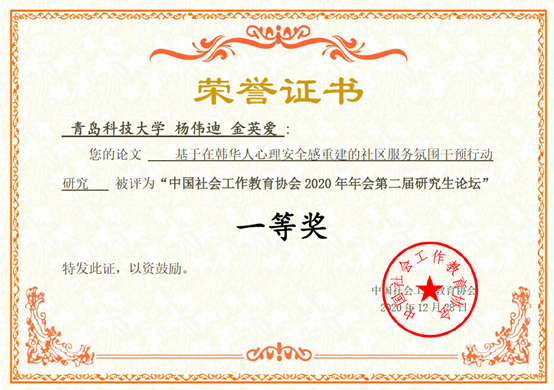 由法学院社会工作系金英爱、陈为智副教授分别指导的2017级本科生杨伟迪和2020级MSW硕士生陈金羽两名同学分别取得了一等奖、三等奖的优异成绩。
