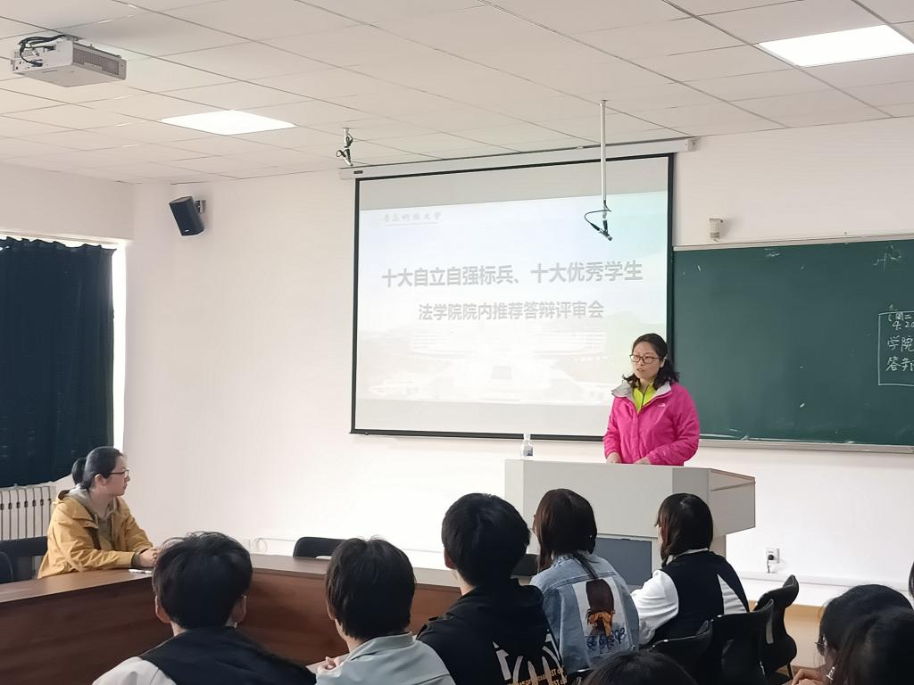 为全面落实立德树人根本任务,深入挖掘和宣传表彰大学生先进典型,营造自尊、自信、自立、自强的校园励志氛围,充分发挥先进典型的示范引领和激励作用,4月20日下午,法学院于弘毅楼C-406举办“十大自立自强标兵”“十大优秀学生”院内推荐答辩评审会,学院党总支书记李卉,学院学工办主任、团委书记付继航,学院评审委员会成员,各年级辅导员及学生代表参加,评审会由辅导员李怡然主持。