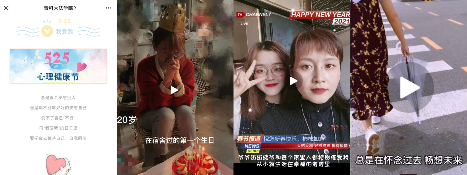 5月中旬,学院策划举办了以“和谐心灵,绽放生命”为主题的成长视频活动。同学们纷纷将自己从小到大的或开心的、或忧伤的、或难忘的瞬间以照片与视频的方式记录了下来。通过回忆和接纳往事,同学们学会了如何更好的了解自己、珍惜当下,绽放自己生命中独特的花朵。