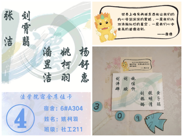 学院学生会为新生宿舍准备了专属门贴及床贴,在门贴设计中融入了法学院10周年的限定元素,配以法学和社工相关专业名言,营造了浓厚的学院氛围。
