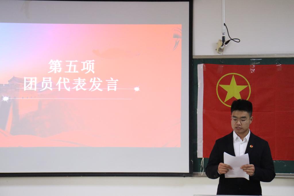 社工201团支部孙源泉同学作为优秀团员代表上台发言,他分享了入团九年来自身的成长与收获,并希望全体团员能坚定信念,奋勇向前,一起树立远大理想。当五四青年的火炬传递到新时代青年手中时,作为共青团员应当形影不辍,履践致远,在学习和工作中起模范带头作用。希望新团员牢记自己的入团誓词,共同奋斗,积蓄力量,将光和热撒满大地,让团徽在胸前永远发光。