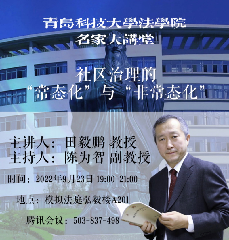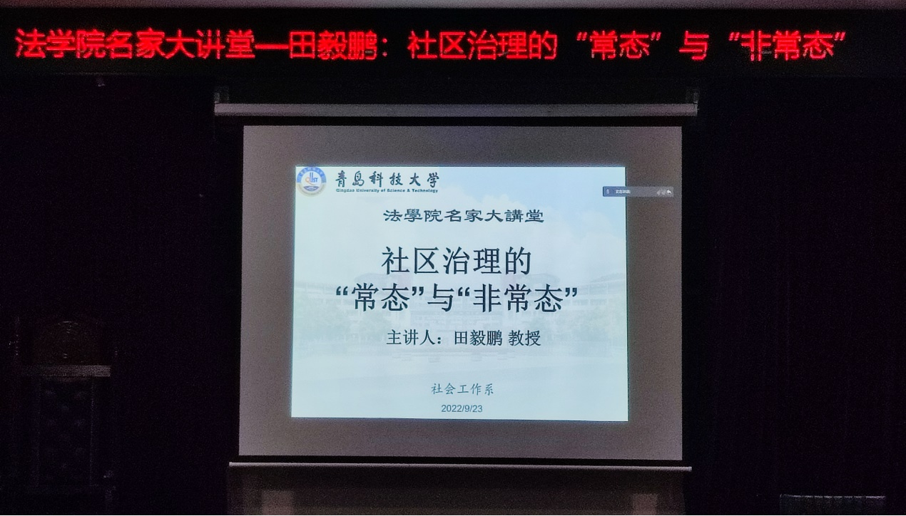 9月23日晚,教育部长江学者特聘教授、中国社会学会副会长、吉林大学哲学社会学院院长、社会学博士生导师田毅鹏教授,受邀为法学院广大师生做了题为《社区治理的“常态”与“非常态”》的精彩报告。报告会由法学院副院长陈为智主持,法学院王卫国、刘琰等教师参加报告会,本次活动也是青岛科技大学人文社科讲堂第131讲和青岛科技大学法学院名家大讲堂系列之一。