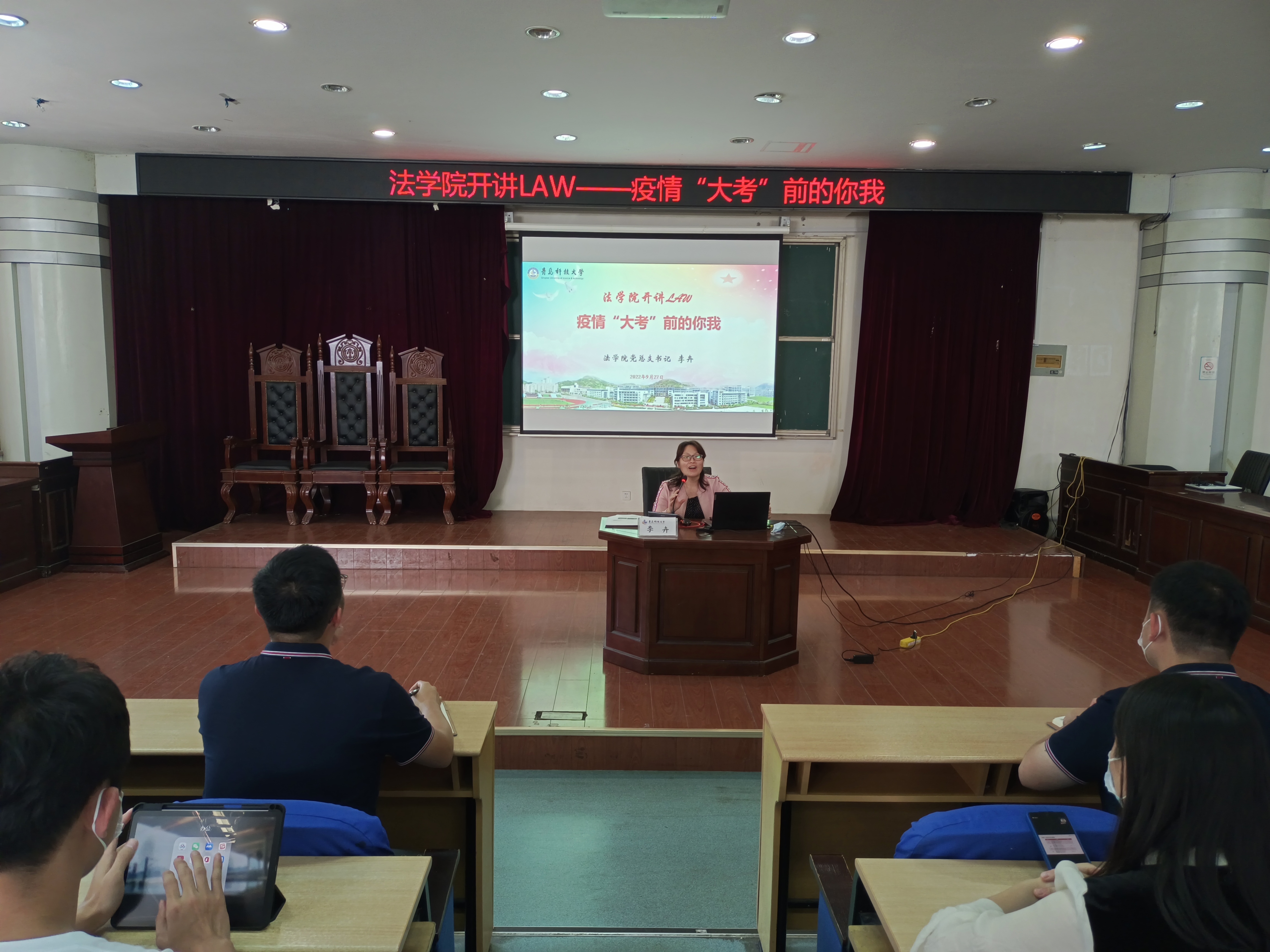 疫情突如其来,为深入细致传达当前学校疫情防控工作最新要求,上好这堂直抵内心、传递正能量、昂扬精气神的“大思政课”。9月27日下午,法学院党总支书记李卉借助学院第一期“开讲LAW”平台,以《疫情“大考”前的你我》为题,在弘毅楼A201为学生代表上了一堂生动的疫情防控思政课,坚定战“疫”信心、凝聚战“疫”力量。学院学工办全体辅导员、青年学生代表一同参加。
