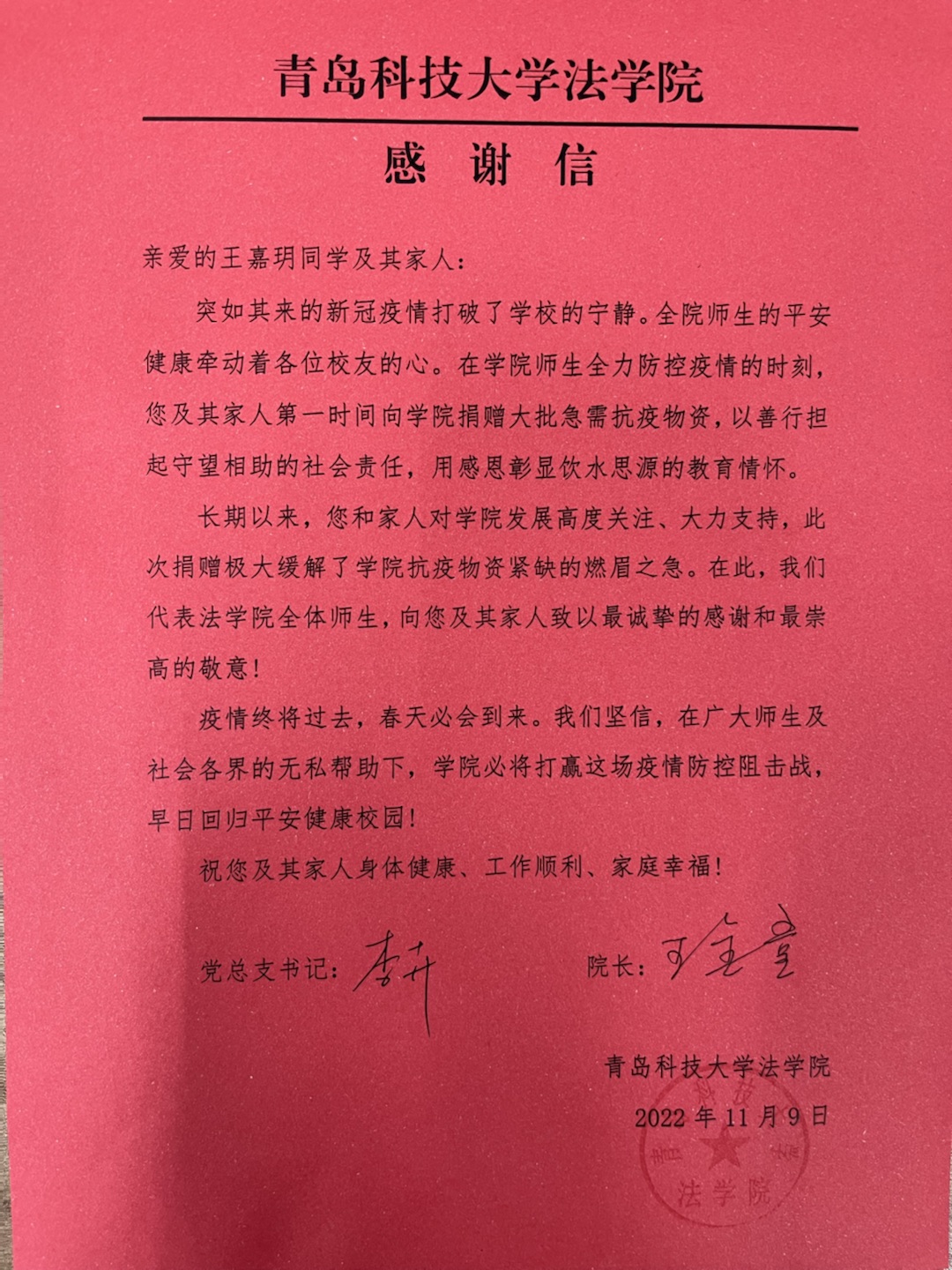 11月3日凌晨,突如其来的疫情给学校崂山校区按下了“暂停键”。面对疫情,法学院师生纷纷以自己的实际行动投身疫情防控工作中,奏响同心战“疫”的主旋律,涌现出许多感人的故事。