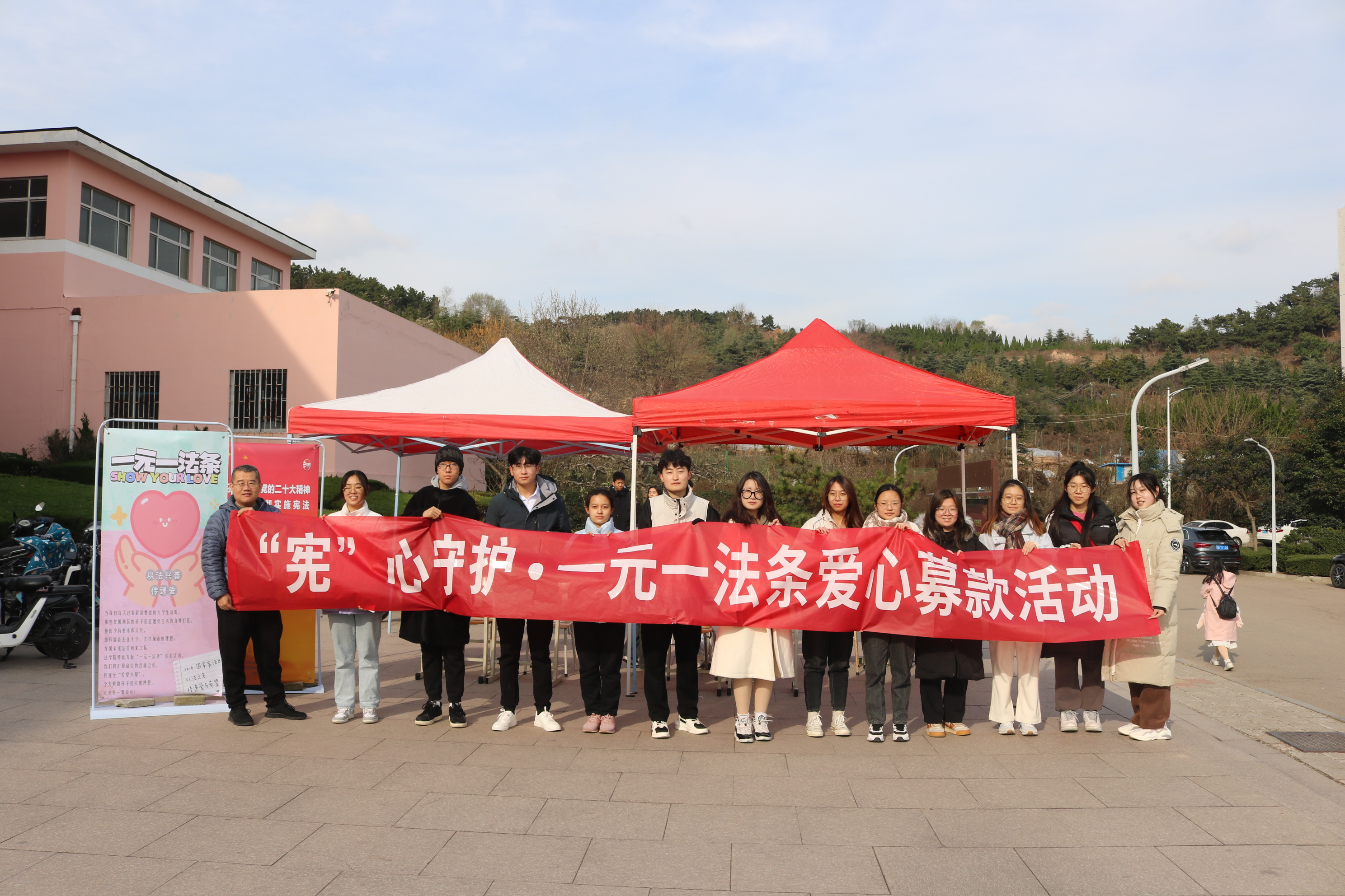 为进一步弘扬宪法精神,为希望小屋的孩子送去冬日的温暖,法学院在南苑餐厅东门举办“宪”心守护•一元一法条爱心募款活动。