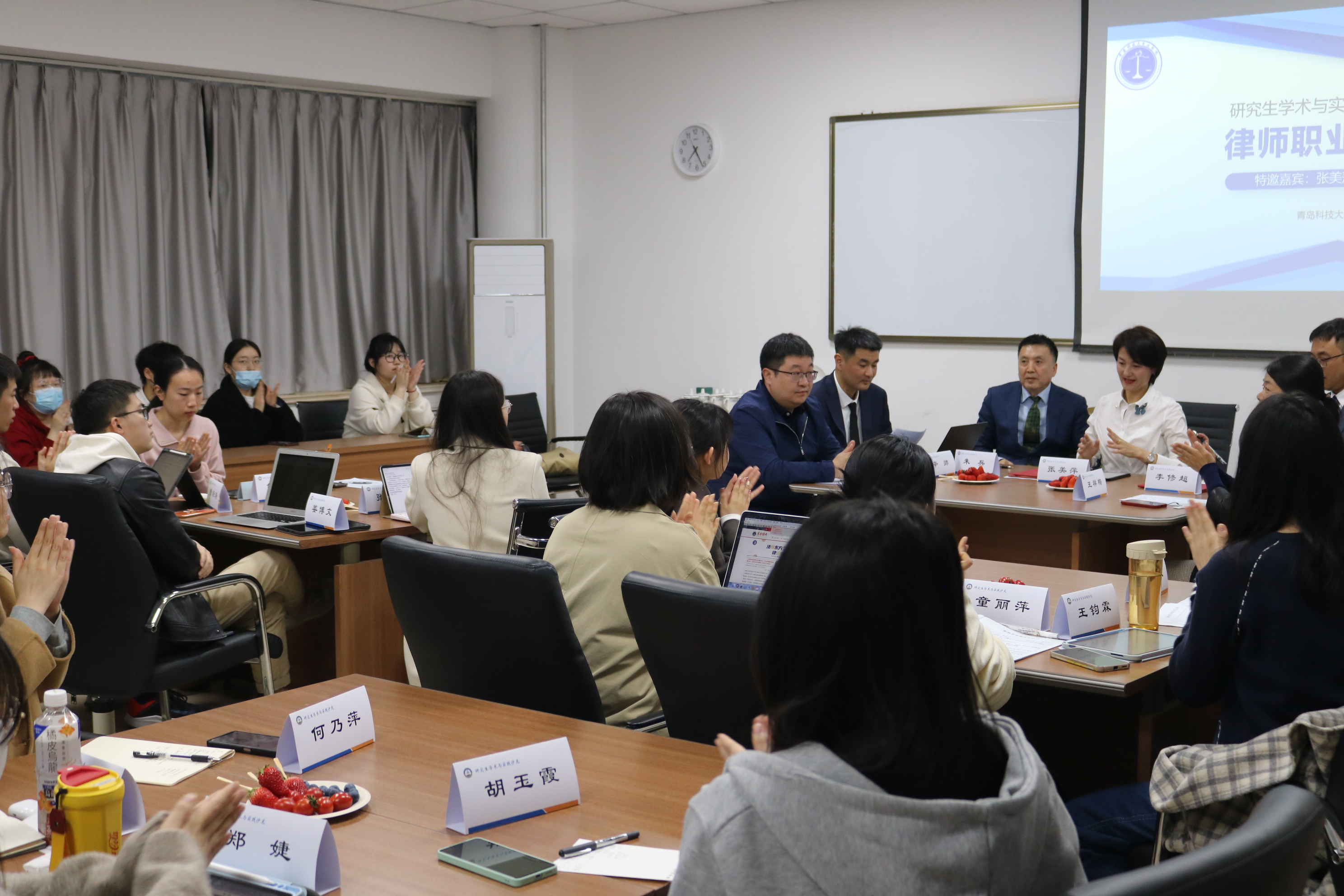 为促进研究生学术交流与实践,营造自由活跃、交叉创新的学习氛围,法学院4月15日启动“研究生学术与实践沙龙”活动。法学院党总支副书记兼副院长王祥梅、法律系主任兼院长助理綦磊、部分研究生和本科生等参加了此次活动。本次活动由学院经济法教研室主任辛帅主持,并特邀北京德和衡(青岛)律师事务所主任张美萍、执行主任李修超、常务副主任朱兵三位律师担任主讲人。