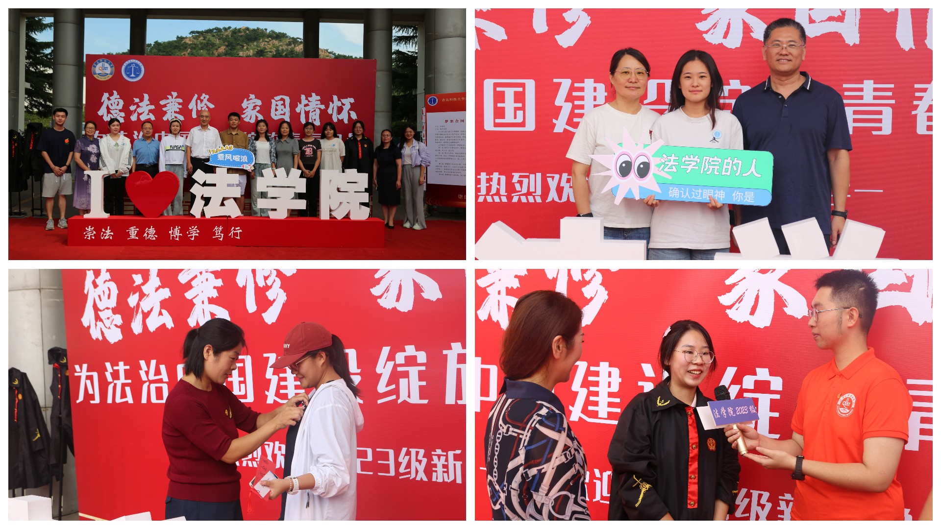 报到现场,学院还为新生准备了独家定制的印有学生姓名的专属院徽和书签,学院领导老师、辅导员为新生佩戴,并送上寄语和期盼。学院还定制了“我爱法学院”特色立牌,引来不少学生和家长驻足合影,进一步增强了学生的归属感和自豪感。“能进入法学院学习非常高兴,今天也感受到了学院对我们的关心和期望,希望大学四年学有所成,成为对社会有用的法治人才。”新生由默在采访时说到。