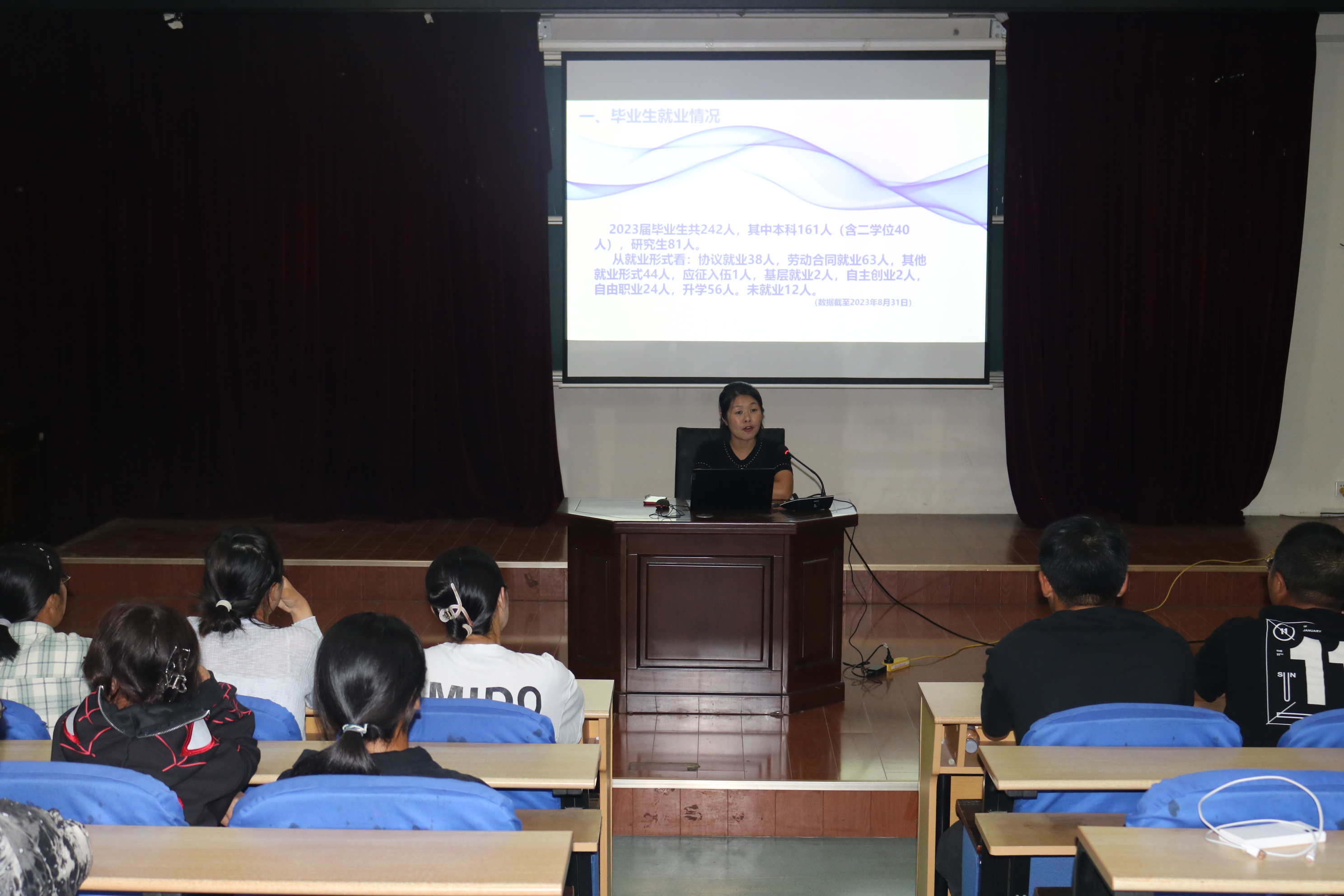 首先,王祥梅结合往届毕业生就业情况和考研上岸情况,用详实的数据和实例强调同学们就业规划时不仅要结合自身的实际情况,更要多方面、多路径、多角度地综合分析,以全面提高综合素质,增强个人竞争力,作出合理的规划。