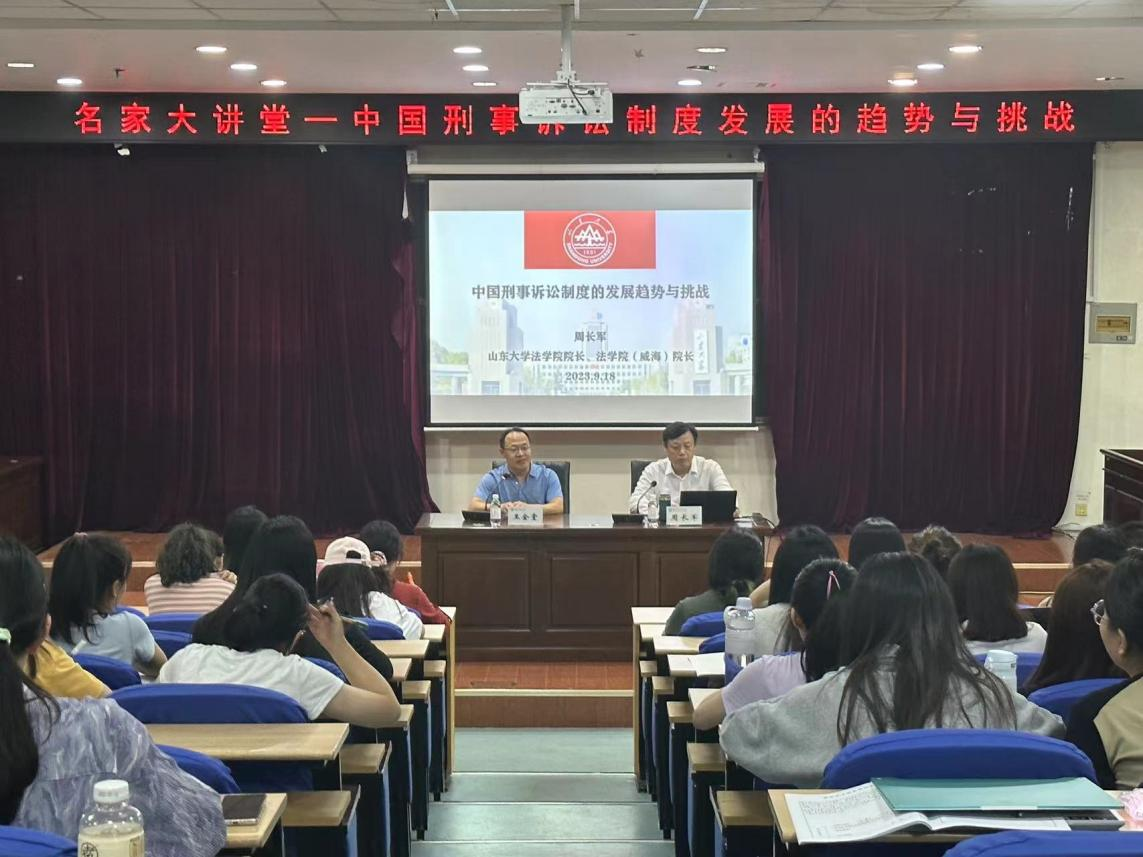 9月18日,山东大学法学院院长、博士生导师、教育部新世纪优秀人才、国务院政府特殊津贴专家、第二届“山东省十大法治人物”周长军受邀作客法学院名家大讲堂,做了题为《中国刑事诉讼制度发展的趋势与挑战》的精彩报告。本次讲座由法学院院长王金堂主持,法学院本科生、研究生200余人参与了报告会。