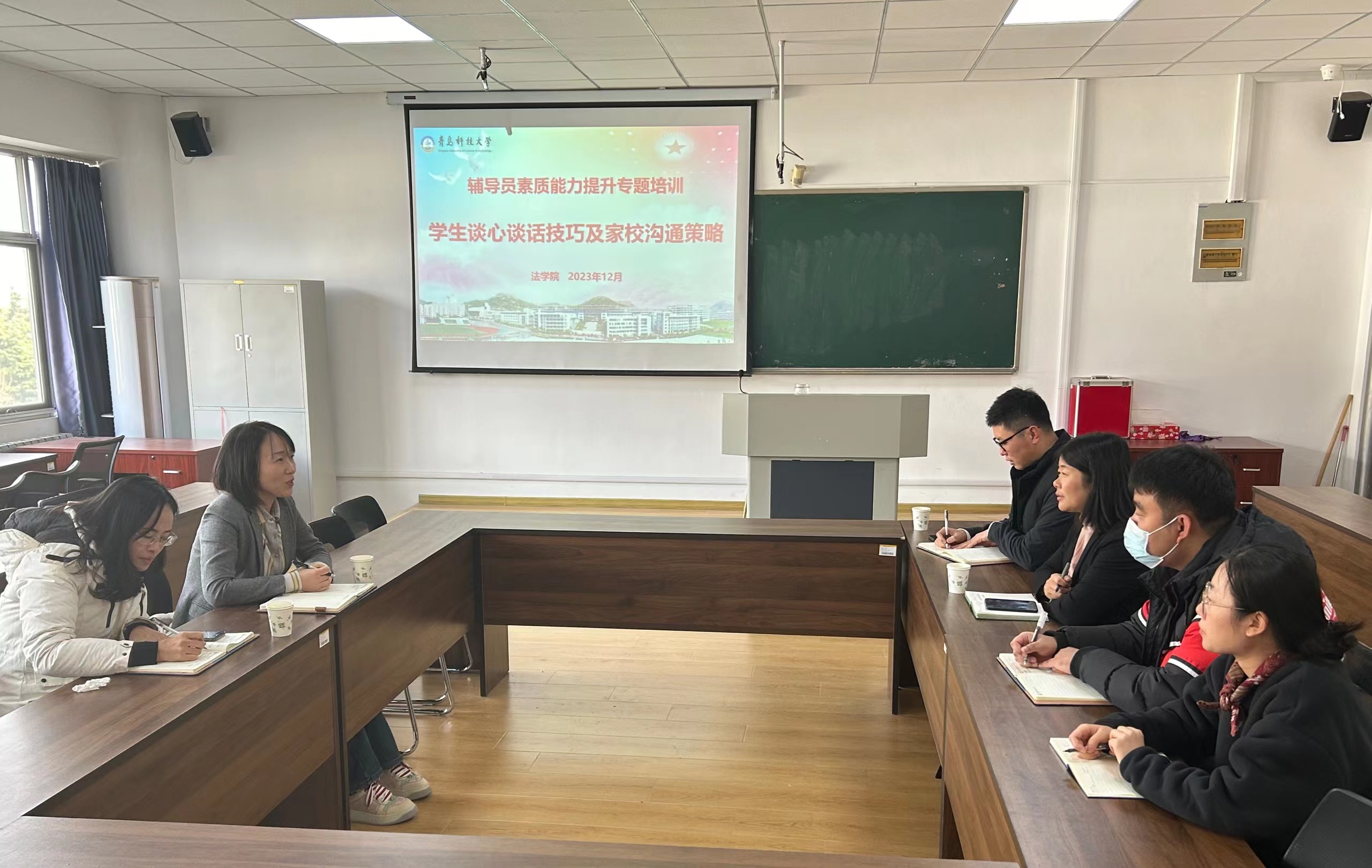 谈心谈话能力是辅导员的基本功,为不断提升辅导员谈心谈话沟通技能和家校沟通能力,12月12日上午,法学院举办辅导员素质能力提升专题培训之“学生谈心谈话技巧及家校沟通策略”,学校心理健康教育与咨询中心主任李海玲担任主讲人,法学院党总支副书记兼副院长王祥梅、学校心理健康教育与咨询中心专职教师殷华敏、全体辅导员参加会议。