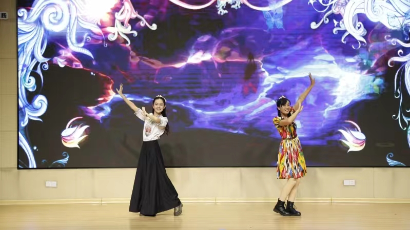 法学院学子以一曲热情奔放的新疆舞《石榴花开》将文艺演出推向了又一个高潮。她们身穿艳丽的民族服装,欢快地舞动着。台下的观众也不由自主地跟着节奏轻轻摇摆,沉浸在这欢乐的氛围中。在舞蹈接近尾声时,她们走下舞台,带着舞动的激情与观众们互动。