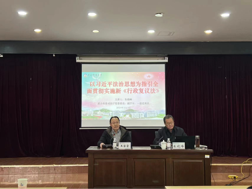 3月3日下午,原山东省司法厅副厅长朱晓峰受邀作客法学院名家大讲堂,做了题为“以习近平法治思想为指引全面贯彻实施新《行政复议法》”的精彩报告。本次讲座由法学院院长王金堂主持,学院教职工、本科生、研究生200余人参加了讲座。