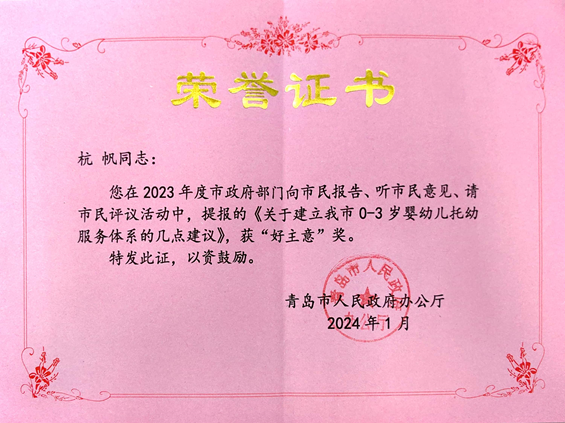 近日,在青岛市“三民”活动中,法学院杭帆老师提报的《关于建立我市0-3岁婴幼儿托育服务体系的几点建议》荣获“好主意”奖,青岛市政府办公厅为其颁发荣誉证书及奖金。