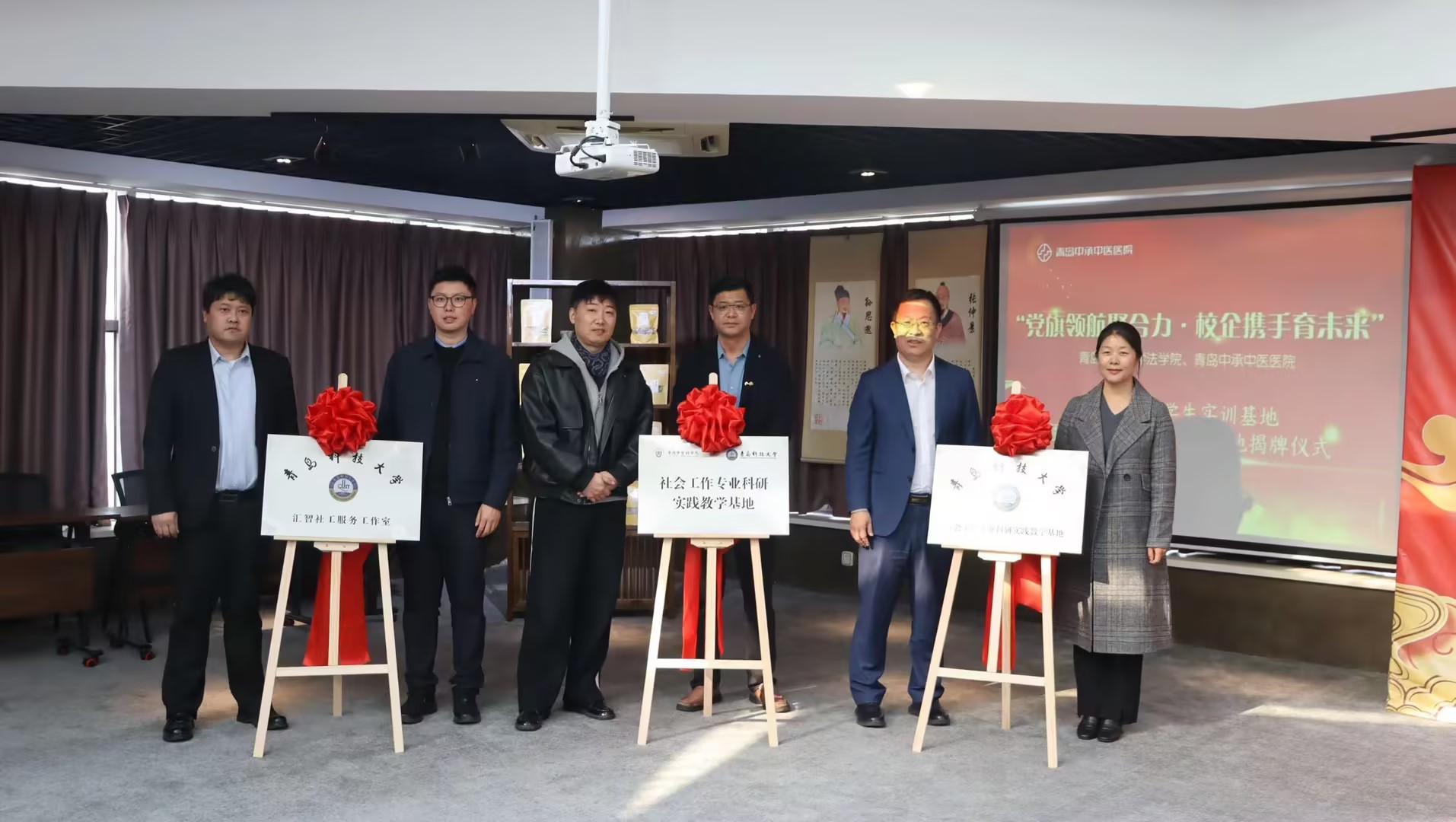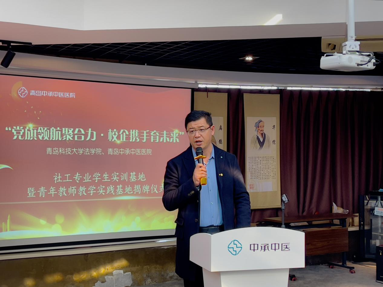 为进一步推动校地资源融合,提升人才培养质量,3月22日下午,法学院联合青岛中承中医院举办“党旗领航聚合力·校企携手育未来”社会工作专业师生实践实训基地和社会工作专业服务基地揭牌仪式。青岛中承中医医院院长陈炜、法学院党委书记曲明、党委副书记兼副院长王祥梅和双方代表出席揭牌仪式。