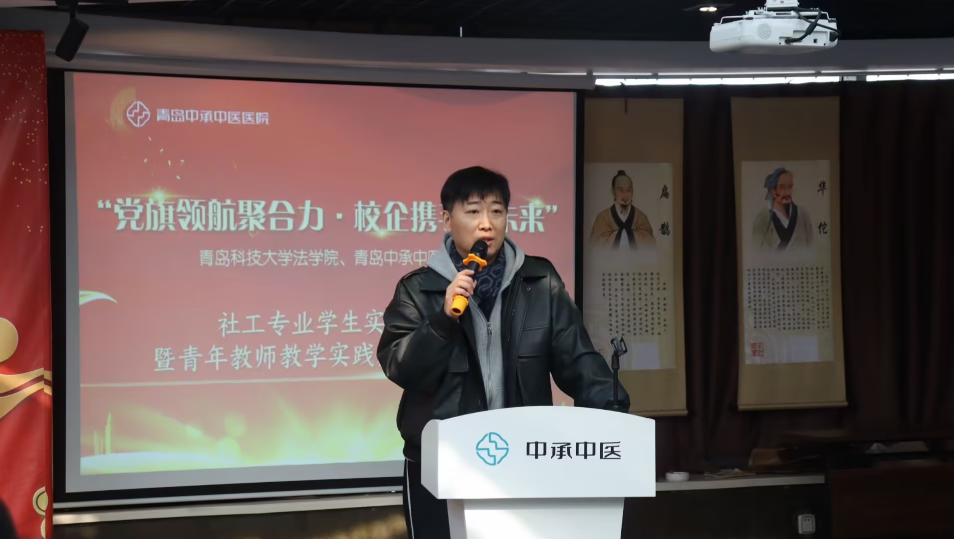 会议伊始,曲明首先表达了对本次校地合作的祝贺,随后介绍了近年来学院一直致力于培养具有创新精神和实践能力的高素质人才,本次通过与青岛中承中医院的合作,将为学生提供更加贴近实际、更加深入的社会工作实践机会,进一步拓宽了校企合作路径,有助于提升学生的综合素质和实践能力,同时也期待通过此次合作,进一步推动法学院与医疗机构的深度合作,共同探索社会工作在医疗领域的应用与发展。