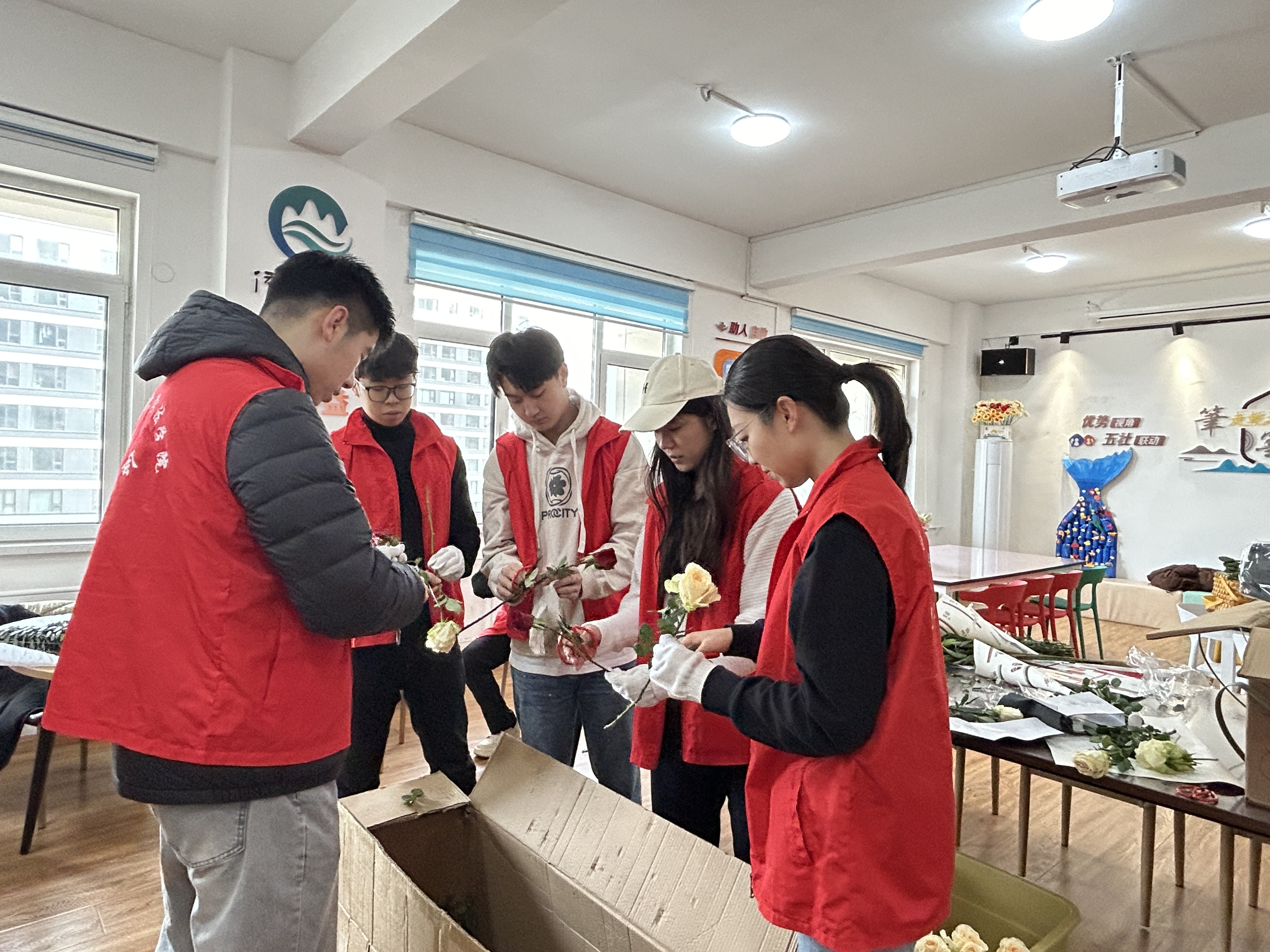 清扫工作结束后,志愿者们又迅速投入到为三八妇女节准备社区福利花束的工作中。他们将采购来的花材精心分类整理,并细致地进行修剪,让每一枝花都能绽放出最美的姿态。在志愿者们的巧手装扮下,原本零散的花材变得整齐有序,焕发出蓬勃生机。