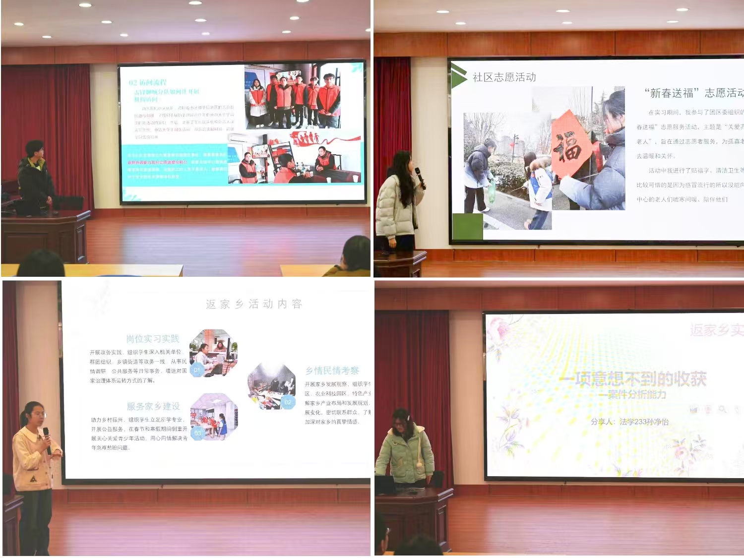 各实践团队从实践背景、实践内容、实践过程等多个方面,采取PPT、视频等方式展开分享。同学们通过生动的案例、翔实的数据和深刻的感悟,展示了他们在实践过程中的所见、所思、所感。在本次社会实践中,法学院青年学生将专业知识与社会实践深度结合,聚焦乡村振兴、基层服务、法律宣传等重点领域,充分发挥自身专业优势,积极开展法律知识普及、社会调研、法院实习等一系列丰富且扎实的实践活动。