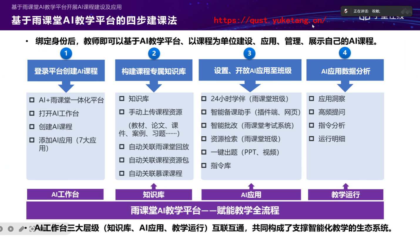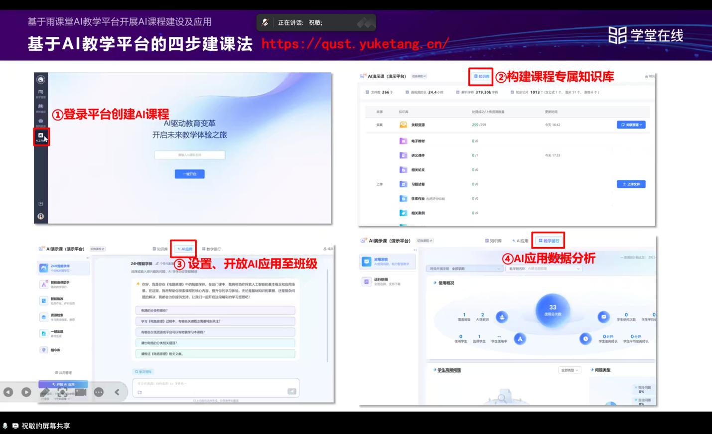 此次培训由清华大学学堂在线的祝敏老师主讲。祝敏以“雨课堂AI教学平台”为演示平台,详细介绍了基于该平台的四步建课法,包括登录平台创建AI课程、构建课程专属知识库、设置AI应用至班级以及AI应用数据分析。通过实操演示,展示了如何利用雨课堂平台实现智能备课、智能批改、资源检索、24小时学伴、指令库等功能,多方面展示了AI技术在教学全流程中的赋能作用。