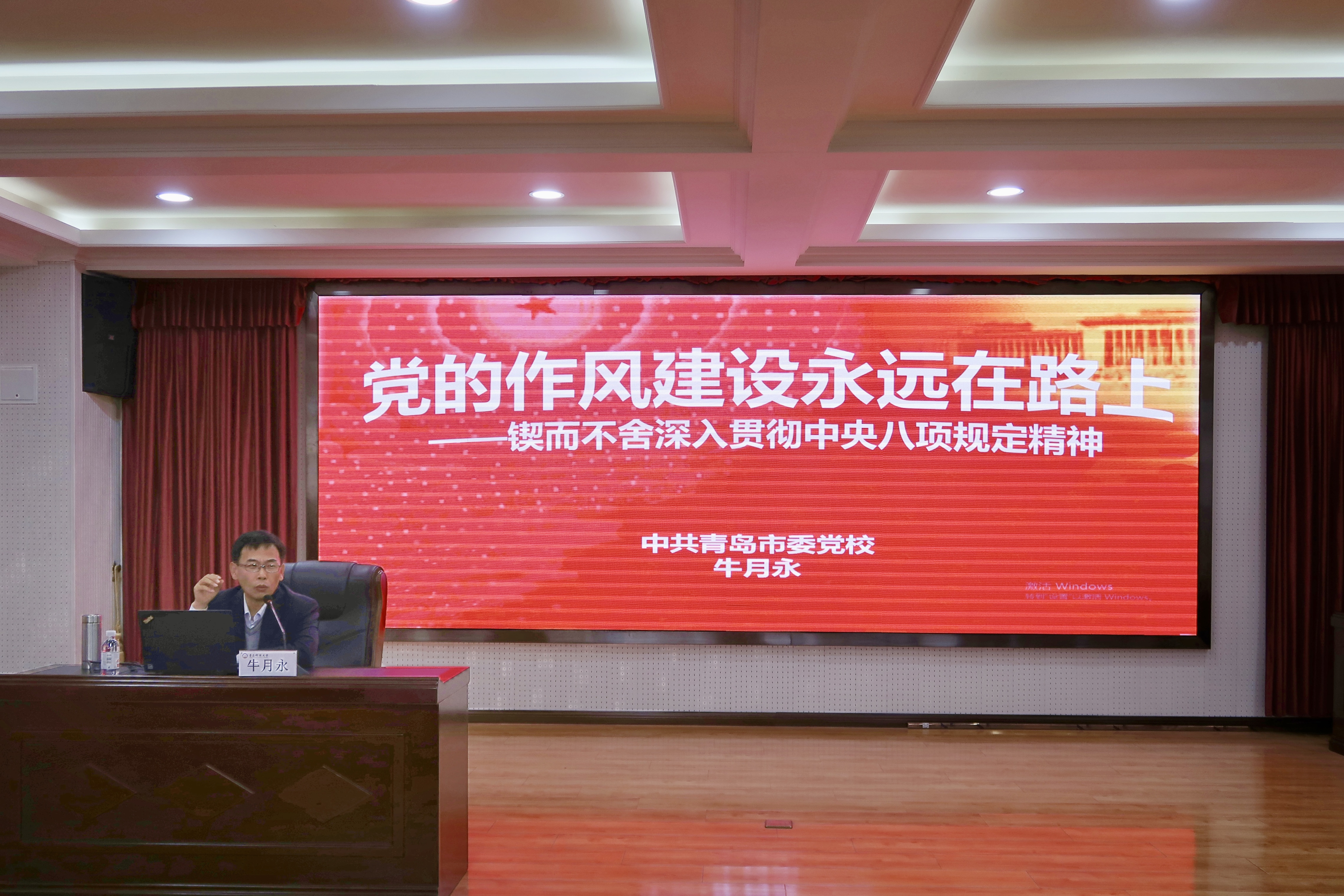 为深入学习贯彻中央八项规定精神,切实增强党员干部遵规守纪意识,推动作风建设常态化、长效化,4月8日下午,法学院党委理论中心组全体成员赴马克思主义学院开展《党的作风建设永远在路上——锲而不舍深入贯彻中央八项规定精神》主题报告专题学习,报告由中共青岛市委党校校刊部主任牛月永教授主讲。