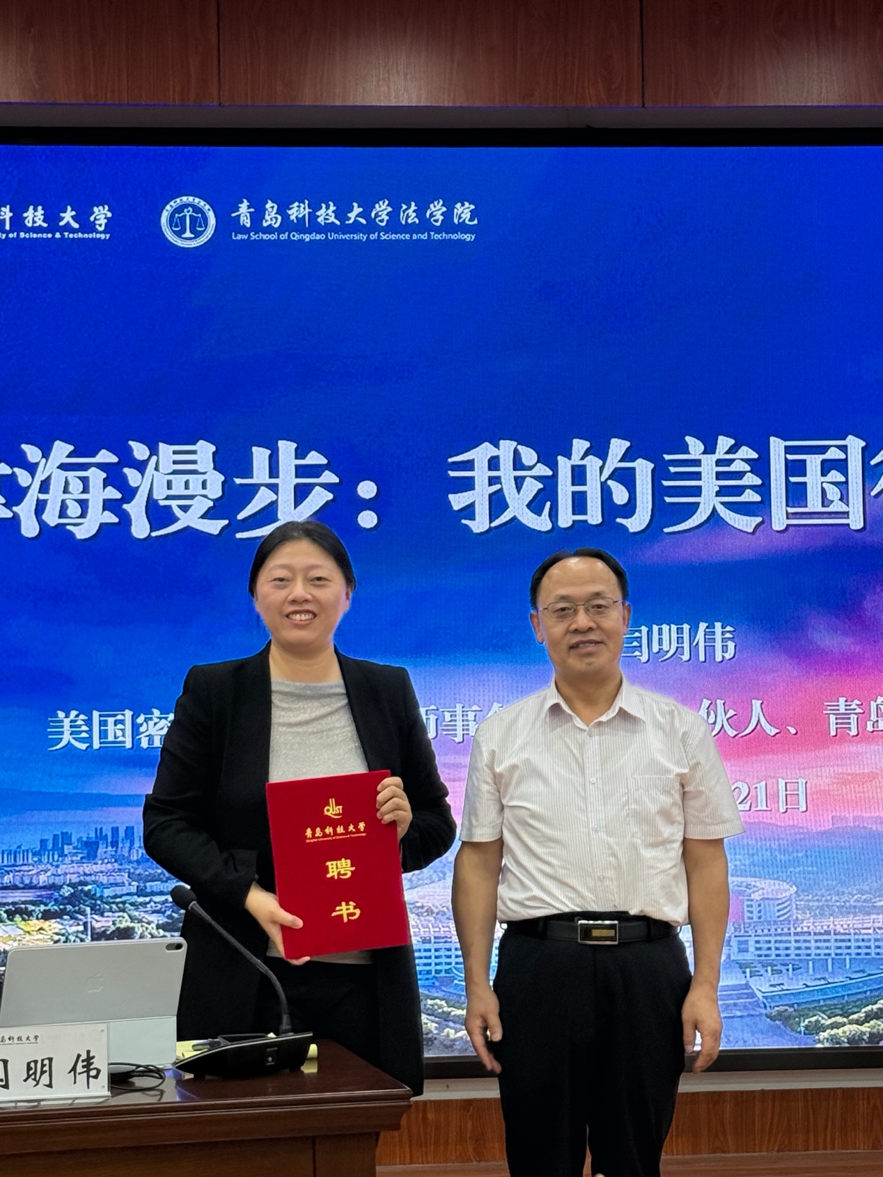 9月21日下午,法学院在弘毅楼A201模拟法庭举办青岛科技大学校友会系列活动之一“校友论坛 开讲LAW”。活动主题为“律海漫步——我的美国律师执业路”。法学院优秀校友、美国密歇根铭蔚律师事务所合伙人闫明伟受邀主讲。活动由法学院院长助理、法律系主任辛帅主持,法学院院长王金堂教授,青岛科技大学法律行业校友会会长、锦天城律师事务所青岛分所主任王宇,山东文康律师事务所网络安全与数据合规专委会主任马清泉,青岛科技大学法律行业校友会副秘书长、山东文康律师事务所网络安全与数据合规专委会副主任王译萱出席活动,法学院研究生和本科生代表参加了本次活动。