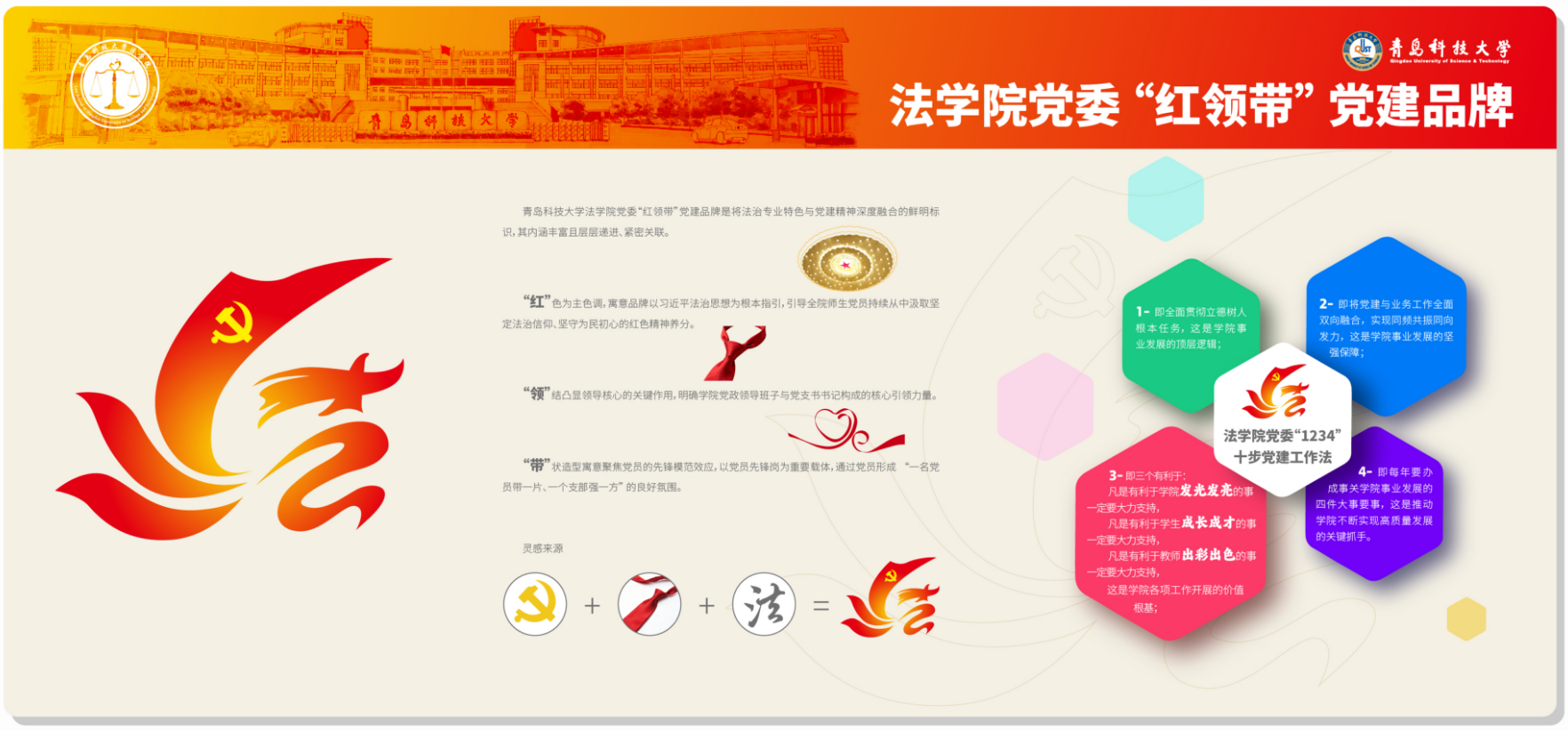 在“红领带”党建品牌引领下,法学院党委持续推动党建与中心工作深度融合,探索建立“1234”十步党建工作法, 即“1”个顶层逻辑:全面落实立德树人根本任务;“2”个融合机制:党建与业务工作“双促双融”;“3”个有利于:凡是有利于学院发光发亮、有利于学生成长成才、有利于教师出彩出色的事业均全力支持、全程保障;“4”件事关学院事业发展的大事要事,靶向破解学科科研、人才队伍、育人质量等关键难题。 实践表明,“1234”十步党建工作法是深化学院“红领带”党建品牌建设的实 践逻辑,是推动学院不断实现高质量发展的关键抓手。