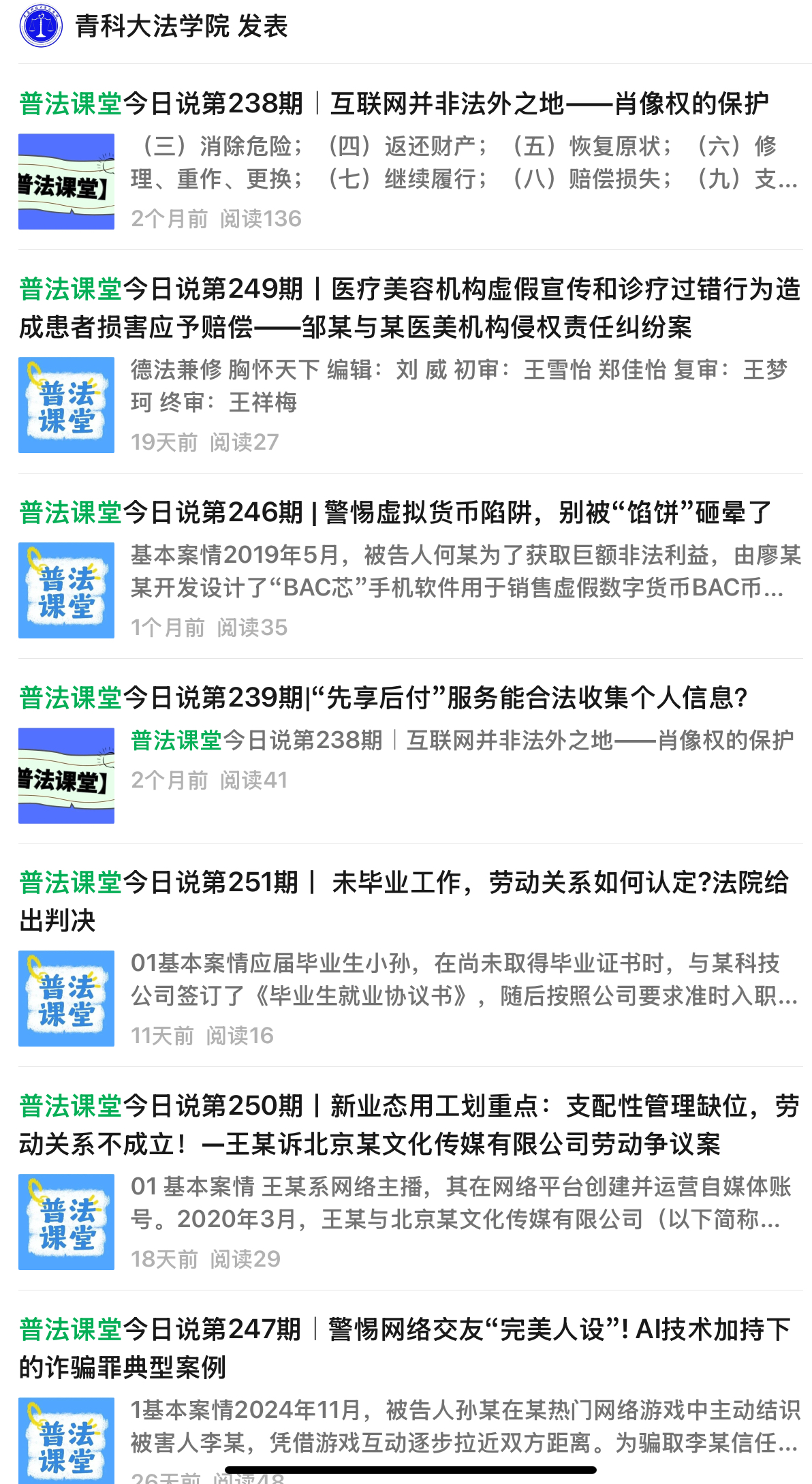 “蒲公英”校园普法服务项目自启动以来,依托学院专业学科优势,精准对接全校同学在法律知识学习、权益保护等方面的核心需求,构建起以“微普法”法律服务为核心的“1+2+N”服务体系,切实为广大学子提供可见、可感、可用的法律支持与服务保障。截至目前,项目累计推出“普法课堂”专题内容252期,总阅读量突破5万人次;依托“法律服务码上有”平台,累计提供有效法律咨询与援助25人次,问题解决率达到92%;组织开展模拟法庭活动10余场,参与学生满意度持续保持在98%以上。项目还曾获全国高校思政网、中央主题教育官网专题报道。