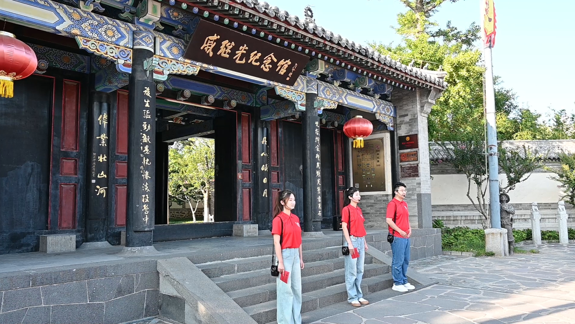 在戚继光纪念馆门前,实践团成员汇报本次社会实践情况,他们聚焦戚继光抗倭事迹中蕴含的法治精神和爱国精神,将所思所想转化为青言青语,传递新时代青年响亮的时代强音,传播新时代的爱国主义。