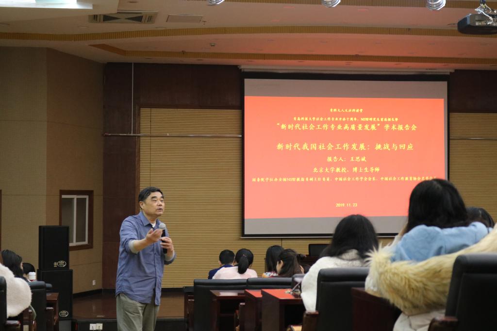 11月23日,“新时代社会工作专业高质量发展”学术研讨会在崂山校区综合服务楼3015会议室和第一报告厅举行。全国社会工作专业学位研究生教育指导委员会原副主任委员、中国社会工作学会会长、中国社会工作教育协会名誉会长、北京大学王思斌教授,全国社会工作专业学位研究生教育指导委员会副主任委员、中国社会工作学会副会长、中国社会工作教育协会副会长、复旦大学文科处处长顾东辉教授,山东省社会工作协会会长、山东大学高鉴国教授等专家出席研讨会。青岛科技大学副校长刘光烨出席会议并致辞。