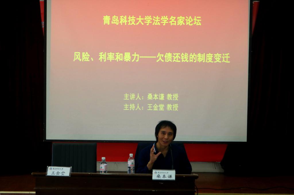 10月24日下午,著名学者、中国海洋大学“繁荣工程”特聘教授桑本谦做客青岛科技大学法学研究生论坛,面向全校师生作“风险、利率和暴力——欠债还钱的制度变迁”的主题讲座。副院长王金堂主持讲座,全体教师与学生出席讲座。